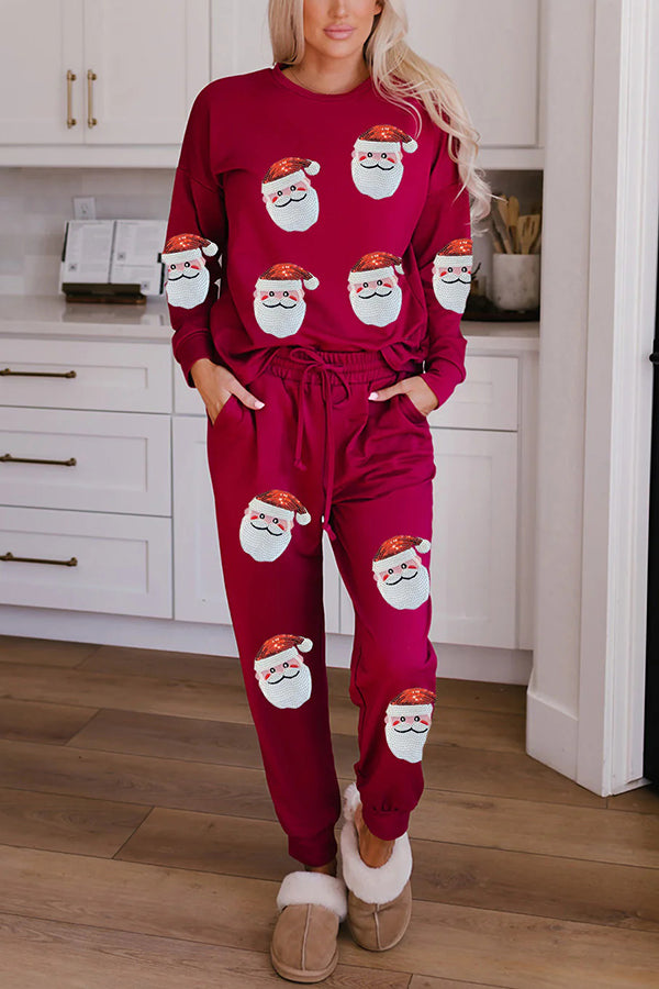 Christmas Sequin Print Long Sleeve Top and Elastic Waist Tie Pocket Pants Set