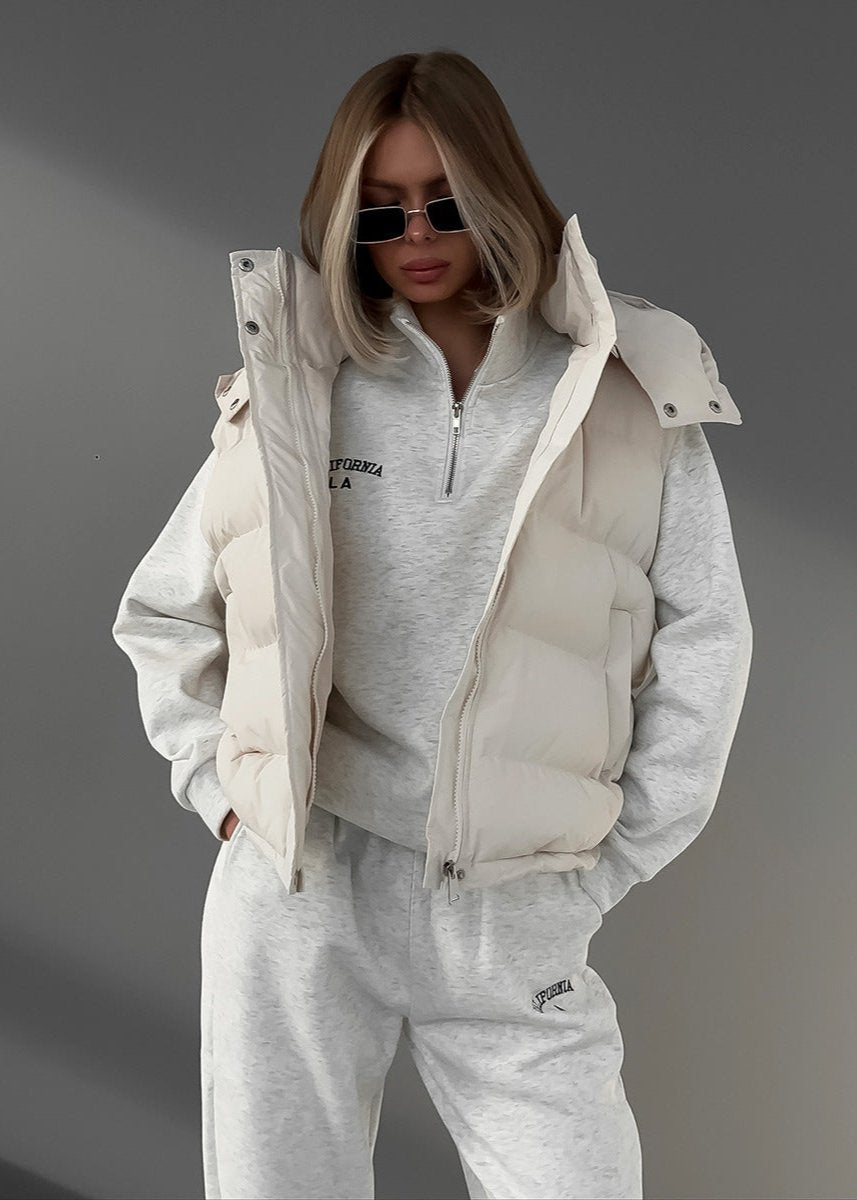 The Cloud Puff Hooded Vest combines modern style with practical comfort. Featuring a quilted design, cozy hood, and sleeveless cut, this versatile vest is perfect for layering during transitional seasons. Its lightweight padding offers warmth without bulk, making it ideal for casual outings or outdoor adventures. Pair it with a hoodie and joggers for a chic, laid-back look.